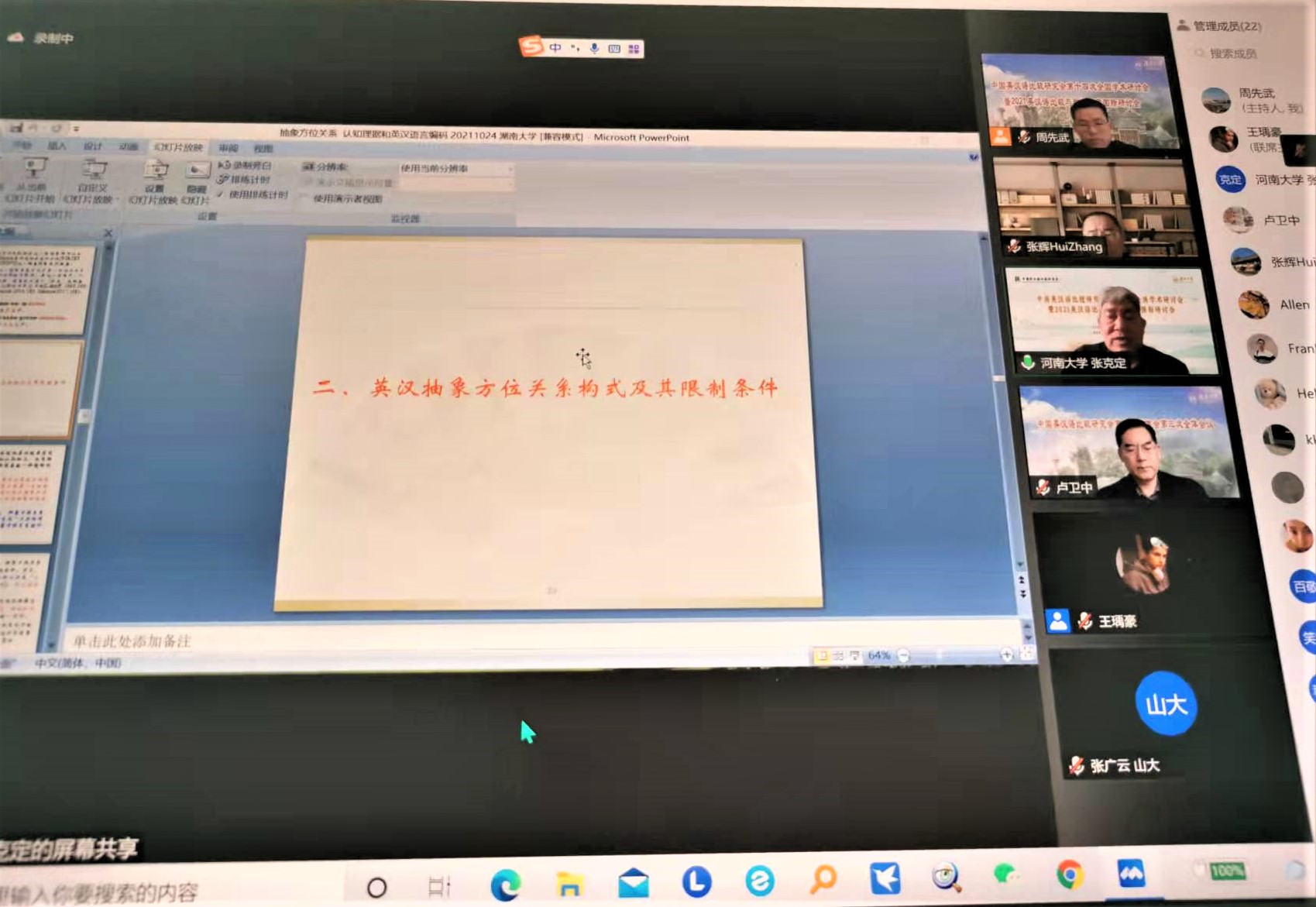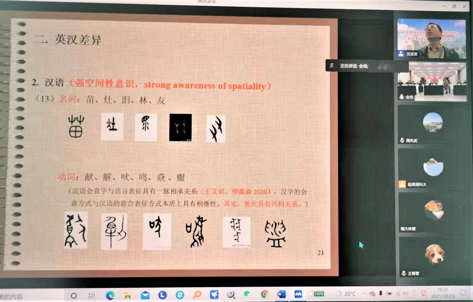 2021年10月22-24日,600全讯白菜周先武博士应邀在线参与中国英汉语比较研究会第十四次全国学术研讨会暨2021英汉语比较与翻译研究国际研讨会,在“语言认知研究”第二分会场担任分会场主持人,并作题为“汉英实体范畴隐喻和转喻型概念合成的语义复合模式对比研究”的学术交流。