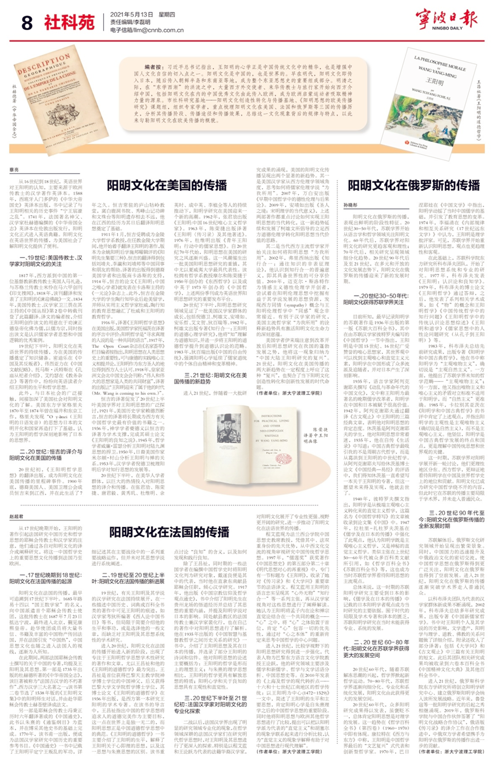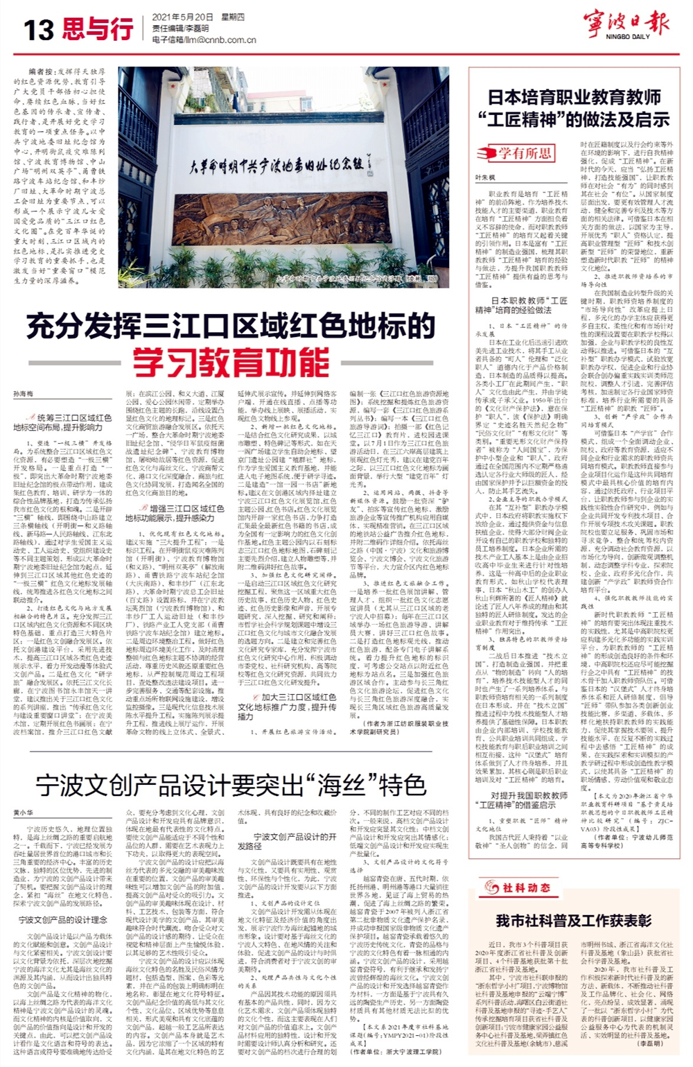 据悉,由基地三位老师撰写的阳明文化海外传播系列文章已于5月13日在《宁波日报(理论版)》刊发,另外基地成员黄小华老师的《宁波文创产品设计要突出“海丝”特色》一文也在5月20日《宁波日报》刊发,这些阶段性成果的发表将进一步激励基地成员以更大的热情投入到阳明文化创造性转化与传播的研究中去。