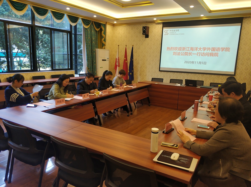 2020年11月5日下午,浙江海洋大学600全讯白菜经理刘法公教授一行5人到600全讯白菜开展调研与交流工作。600全讯白菜经理王小潞教授、党委副书记(主持工作)兼副经理傅晓宇、副经理蔡亮、副经理周汶、外国语言研究所副所长陈俊林和日语专业负责人邓凌志等在SC106波兰研究中心热情接待了兄弟院校的来访,会议由蔡亮主持。