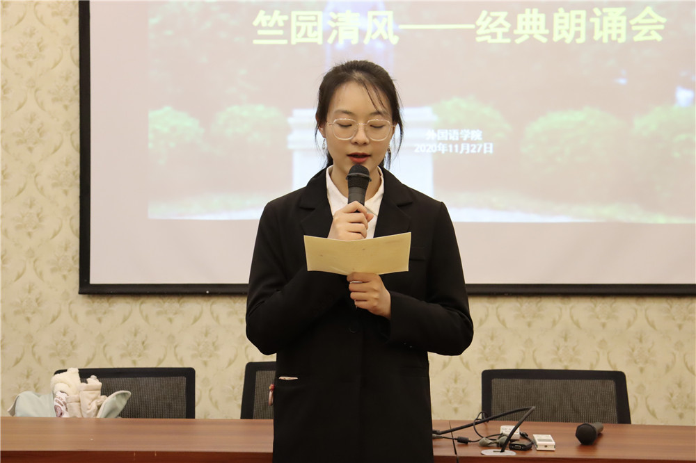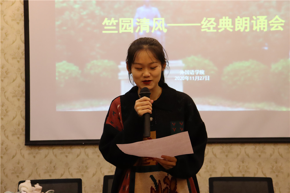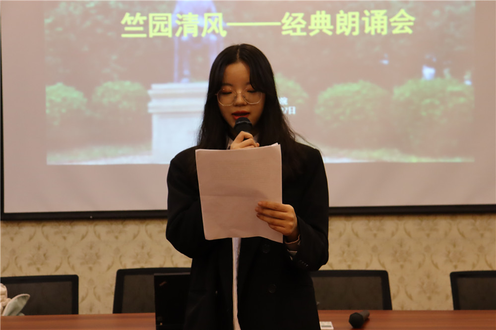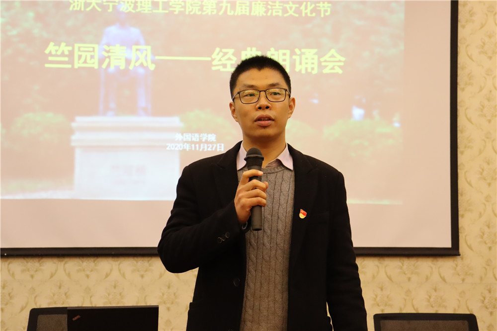朗诵会伊始,任凯介绍竺园的来源并说明了本次廉洁文化节深厚内涵,将竺老的教育思想和求是精神,贯彻到人才培养之中,嵌入每一位学子的脑海中。此外,任老师还以浙大的办学历史为切入点,呼吁大家廉洁修身,共建美丽中国。