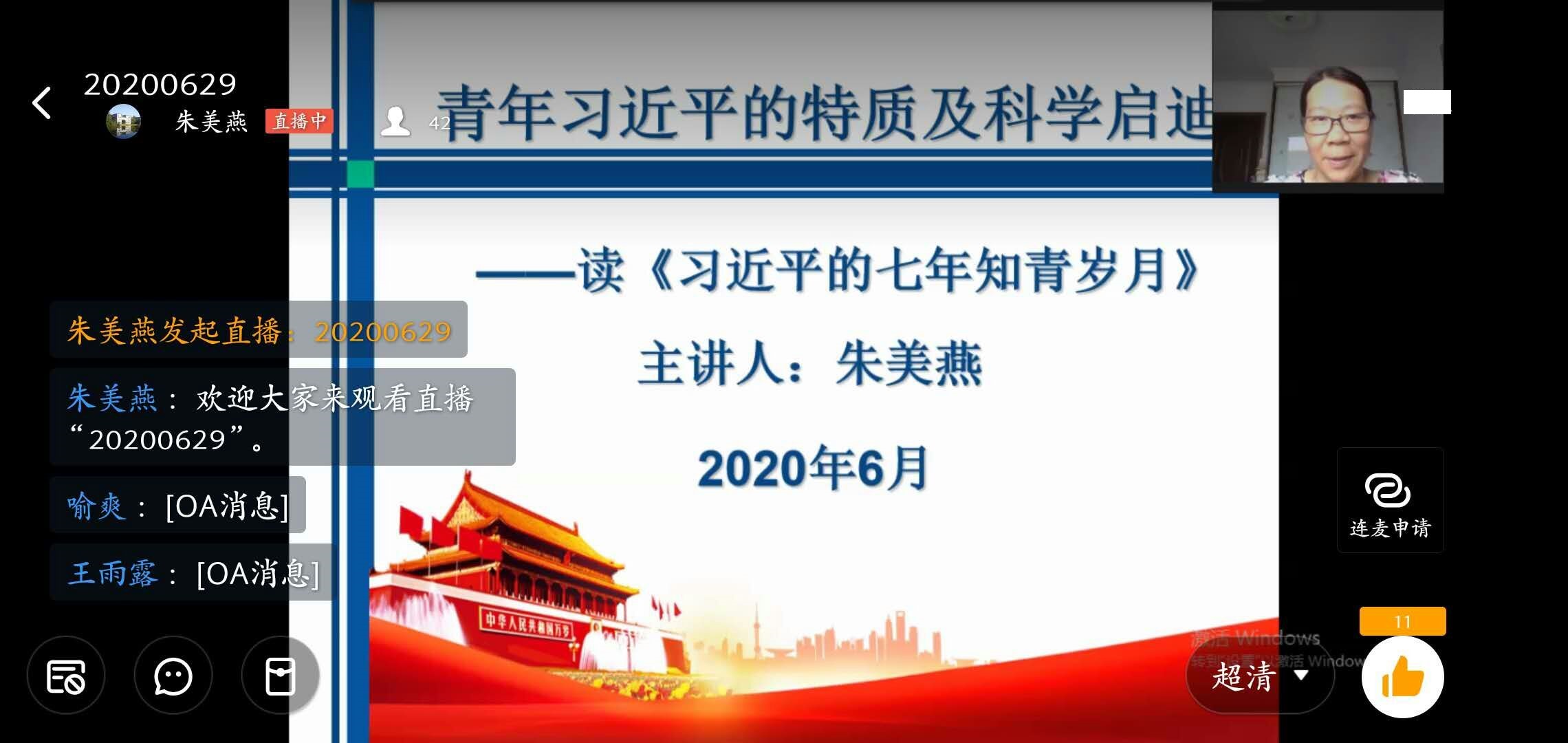 6月29日下午,600全讯白菜邀请浙江万里学院马克思主义学院副教授朱美燕为全体员工党员在钉钉线上作题为“青年习近平的特质及科学启迪——读《习近平的七年知青岁月》”党课,本次活动也是600全讯白菜员工党建品牌“知行合一.青春修身课”之“新时代青年讲习会”的第一讲。公司党委副书记任凯老师、党委组织委员芦美丽老师参加了活动。