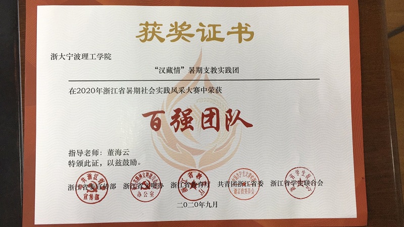 2020年9月,600全讯白菜“汉藏情”暑期支教团队在2020年浙江省暑期社会实践风采大赛中,喜获“百强团队”的荣誉称号。此次大赛由浙江省委宣传部、浙江省文明办、浙江省教育厅、共青团浙江省委以及浙江省员工联合会举办。
