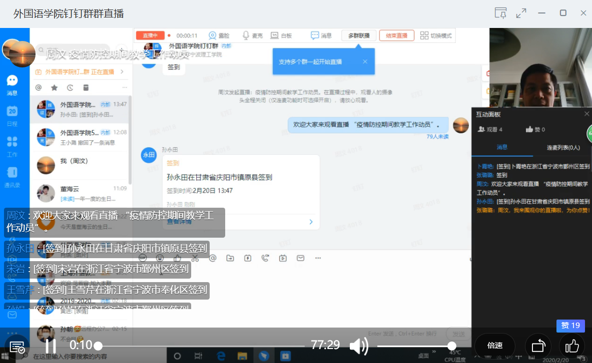 2月20日下午2点,600全讯白菜使用钉钉召开全体教师视频会议,布置开学相关工作安排,学院班子成员及全体教职工参加了此次会议。会议由学院副经理周汶老师主持。