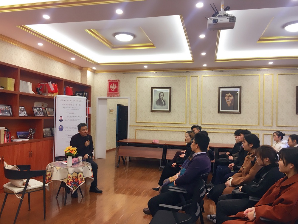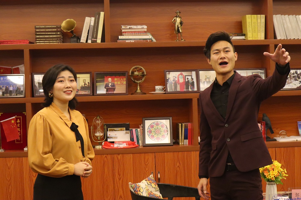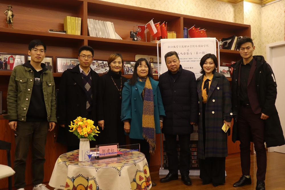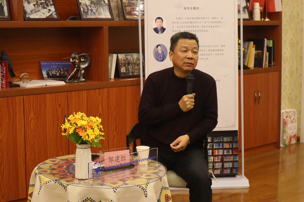 浙江大学宁波理工学院“波兰研究中心”是教育部批准的国别与区域研究中心,聚焦波兰文化,探讨中波交流,“居里夫人会客厅”是该校举办的第二届“波兰周”最后一项重大活动。邹建红从2015年12月赴瑞典为屠呦呦领奖之行策划举办系列演出活动开始讲起,讲他如何被屠教授的人格魅力和精神所打动,下决心要将屠呦呦的精彩故事“搬”上舞台;讲歌剧《呦呦鹿鸣》创作和演出团队如何用“匠心”打磨出了浙江省历史上首部原创的宁波本土民族歌剧;讲《呦呦鹿鸣》演出时群众的热烈反映和影响。他语重心长地告诉老员工们,“只有个人目标与祖国发展相呼应,才能更好地实现人生价值。”在讲述过程中,《呦呦鹿鸣》的两位年轻演员还现场演绎了歌剧中的精彩片段,观众们听的是聚精会神,好多位同学眼眶湿润。活动结束后,员工们的朋友圈掀起了一股了转发活动照片和视频的高潮。