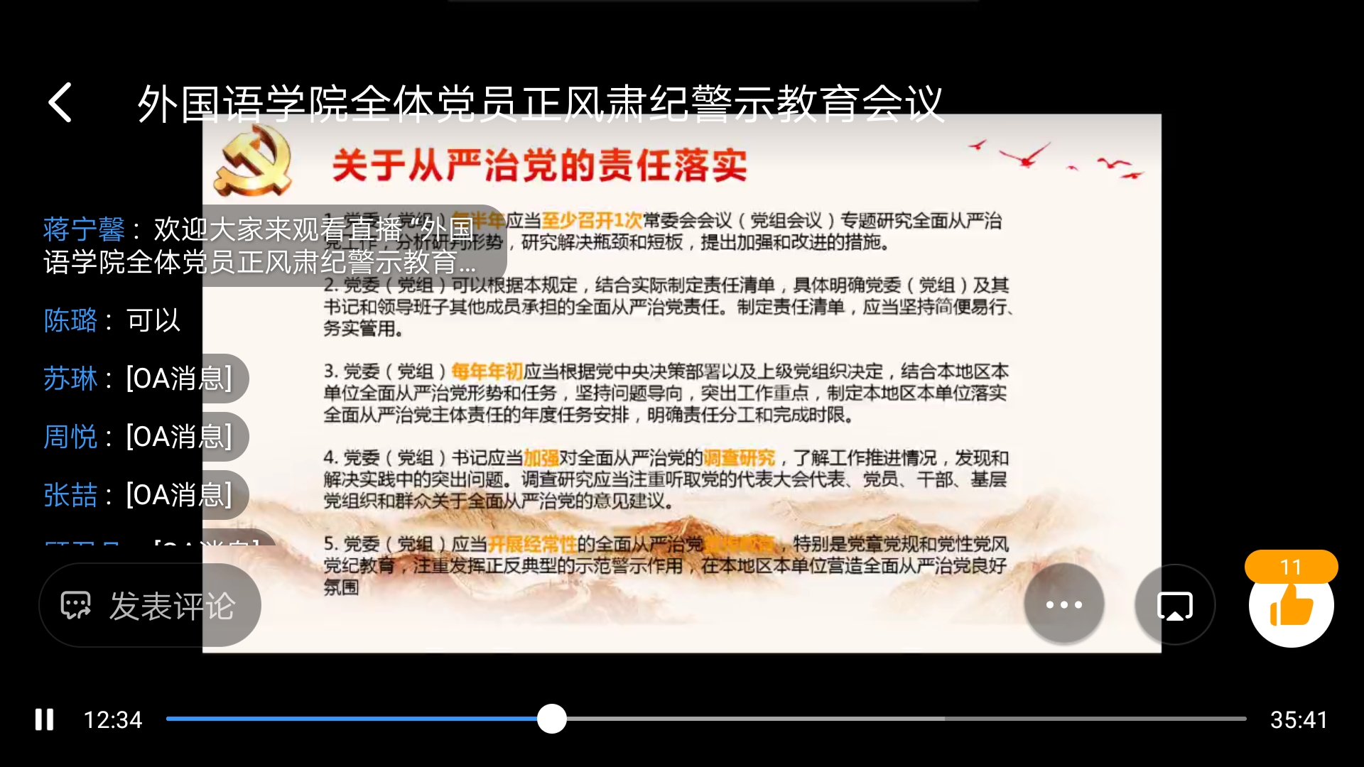 通过全面从严治党的教育学习,同学们进一步认识到,作为一名党员必须“知敬畏、存戒惧、守底线”,从严治党永远在路上。