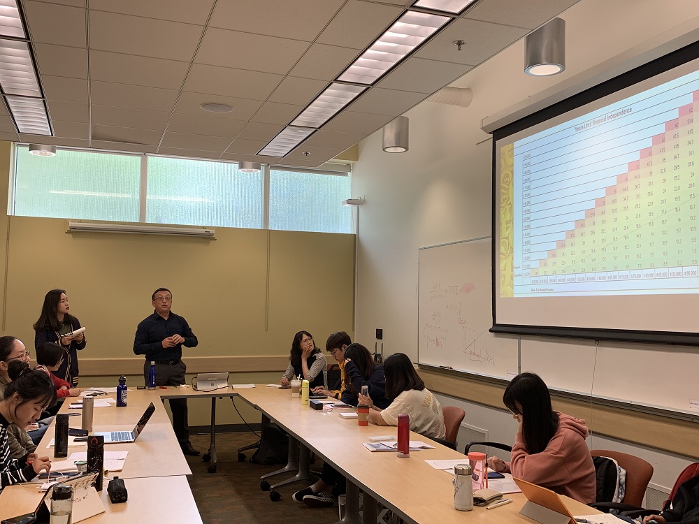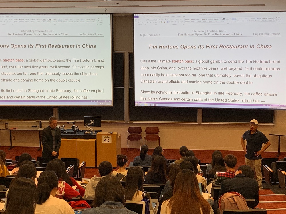 在学习了视译的相关知识和记笔记技巧以后,同学们分成两个小组进行了三天的口译强化训练,练习材料丰富多样,主题有一带一路战略与亚太门户战略、中美贸易摩擦、中加贸易投资,还有关于华为5G、加拿大咖啡品牌TimHortons以及中西方的教育体系比较等内容。老师要求同学们口译时相互录视频,课后自己回看,进行评估。第二天同学们交流自己的口译优缺点,老师作相应点评。经过反复的练习,同学们在周五下午进行了以小组为单位的口译比赛,都取得了不错的成绩。