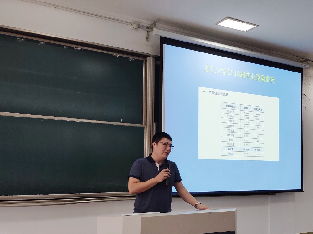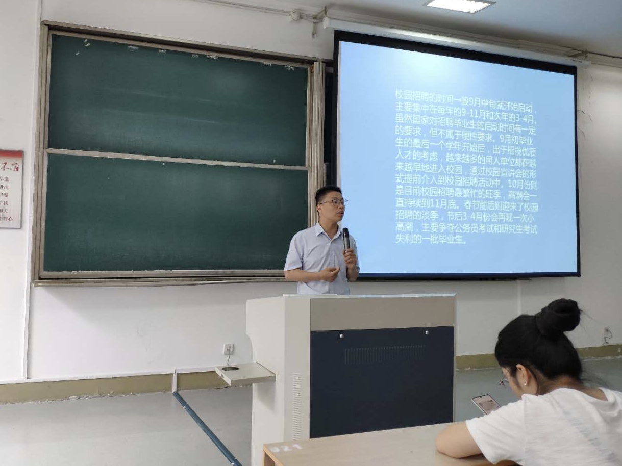接下来,传媒与设计学院的张峰老师向同学们介绍宁波南部商务区和学校周边用人单位的人才招聘概况,同时将公司员工前段时间投递简历量与其他院校进行比较,建议同学们应积极投递简历,增加面试和实习的机会,为今后走上工作岗位做好前期准备。