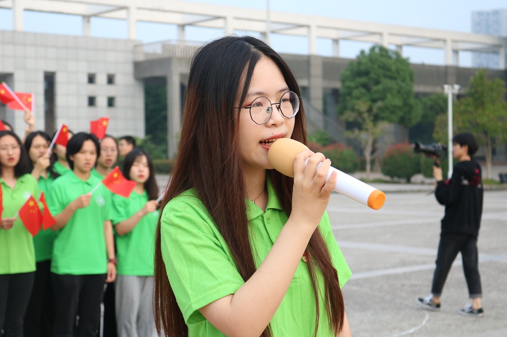 此次升旗仪式上,由学院殷嘉琪、钱弘、沈飞虎、陈迦特等四位同学现场诗歌朗诵《我爱你,中国》,诗声朗朗诵国庆。最后,由张喆同学用英语领唱,全体师生合唱《我和我的祖国》,歌声嘹亮,满怀着骄傲与自豪,抒发对新中国的热爱,盛赞美好新时代。手中的挥动的小红旗与绿色院服交相辉映,以青春之绿,敬礼中国红!