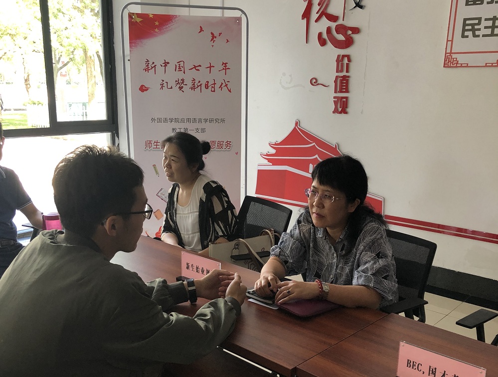为给公司员工在英语学习方面提供指导,600全讯白菜应用语言学研究所教工第一党支部全体党员教师利用10月10日中午休息时间,在SC一楼大厅举办了一场“新中国七十年,礼赞新时代”—英语加油站-师生面对面英语志愿服务活动。