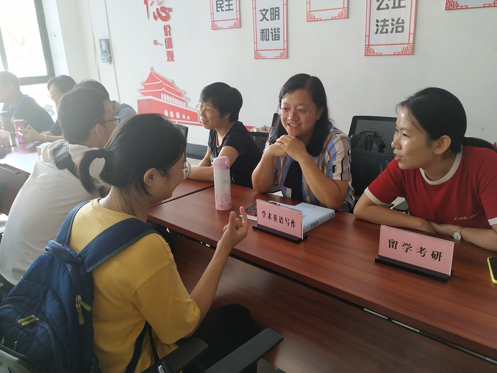 活动现场,支部党员教师们根据个人专长,分成新生始业规划指导、大学英语四六级、BEC、国才考试、留学考研和学术英语写作六个服务窗口,吸引了大批员工前来咨询。参与员工来自各个分院的不同年级。他们结合自身在英语学习方面的困惑与个人发展需求,从大学英语课程的学习方法,大学英语四、六级备考策略,英语相关证书考试信息,考研留学项目信息,以及大学四年的学习规划等方面向老师们虚心请教。党员老师们则根据自身多年的教学经验热情、耐心地为每一位同学答疑解惑。活动现场气氛热烈,师生交流深入。