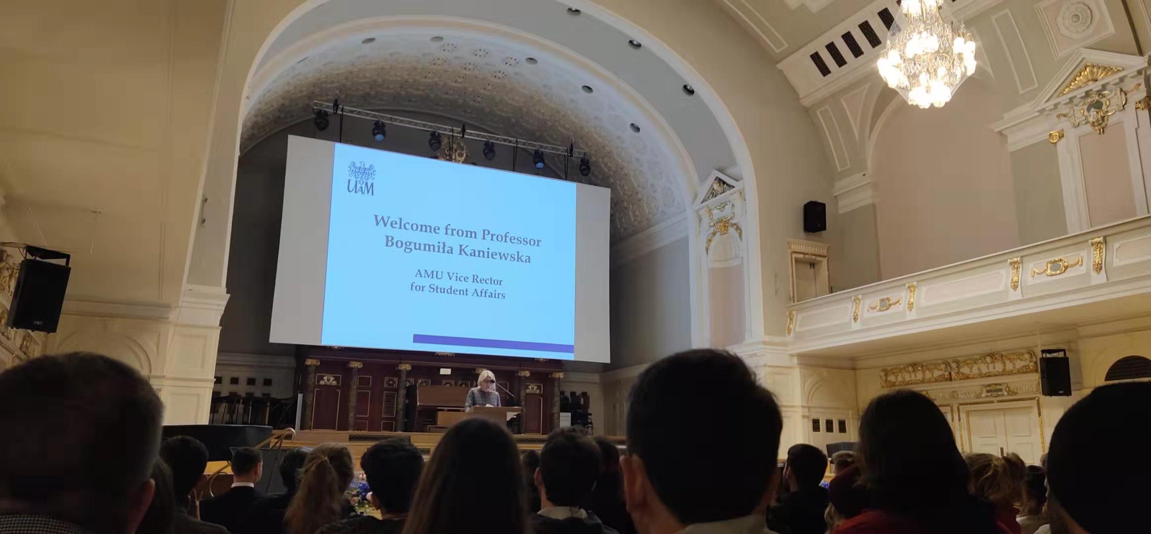 10月2日波兰当地时间下午4点45分,在波兰波兹南密茨凯维奇大学(以下简称“密大”)的主教学楼举行职工开学典礼,浙江大学宁波理工学院通过Erasmus项目赴密大的陈天娇同学作为职工代表收到邀请参加了这次欢迎仪式。典礼由密大外事处的维特科夫斯基先生主持。
