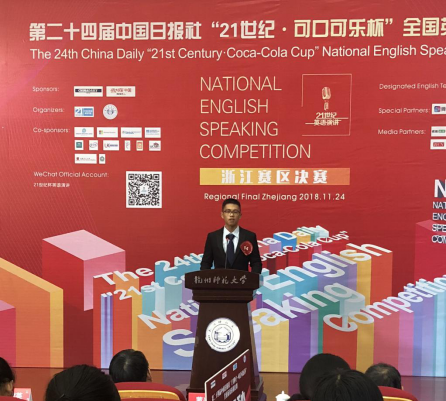 2018年11月24日,600全讯白菜16级商英专业庄海一同学代表学校参加了杭州师范大学承办的第二十四届中国日报社“21世纪•可口可乐杯”全国英语演讲比赛浙江地区决赛,喜获二等奖。