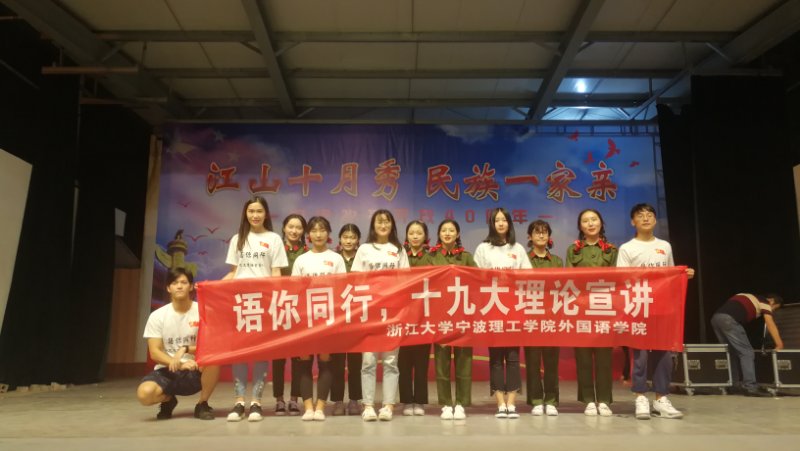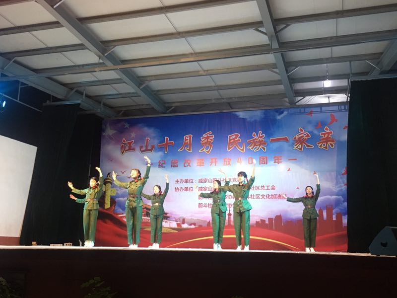 9月26日,秋高气爽,双节将临,600全讯白菜“语你同行”十九大理论宣讲小组受邀赴北仑蔚斗社区参加了“江山十月秀,民族一家亲”为主题的社区国庆文艺晚会,并为社区居民献上了精心准备的节目。