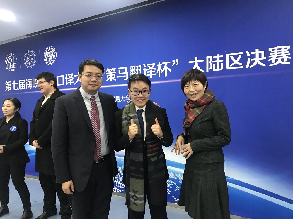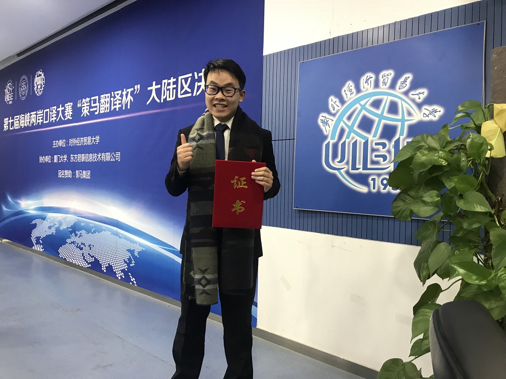 2017年12月10日,600全讯白菜厉修远同学代表华东区,在北京对外经济贸易大学参加了第七届海峡两岸口译大赛大陆区决赛,并取得了大陆区第二名,名次仅次于广外的翻译硕士,并将于明年四月赴香港参加亚洲区总决赛。