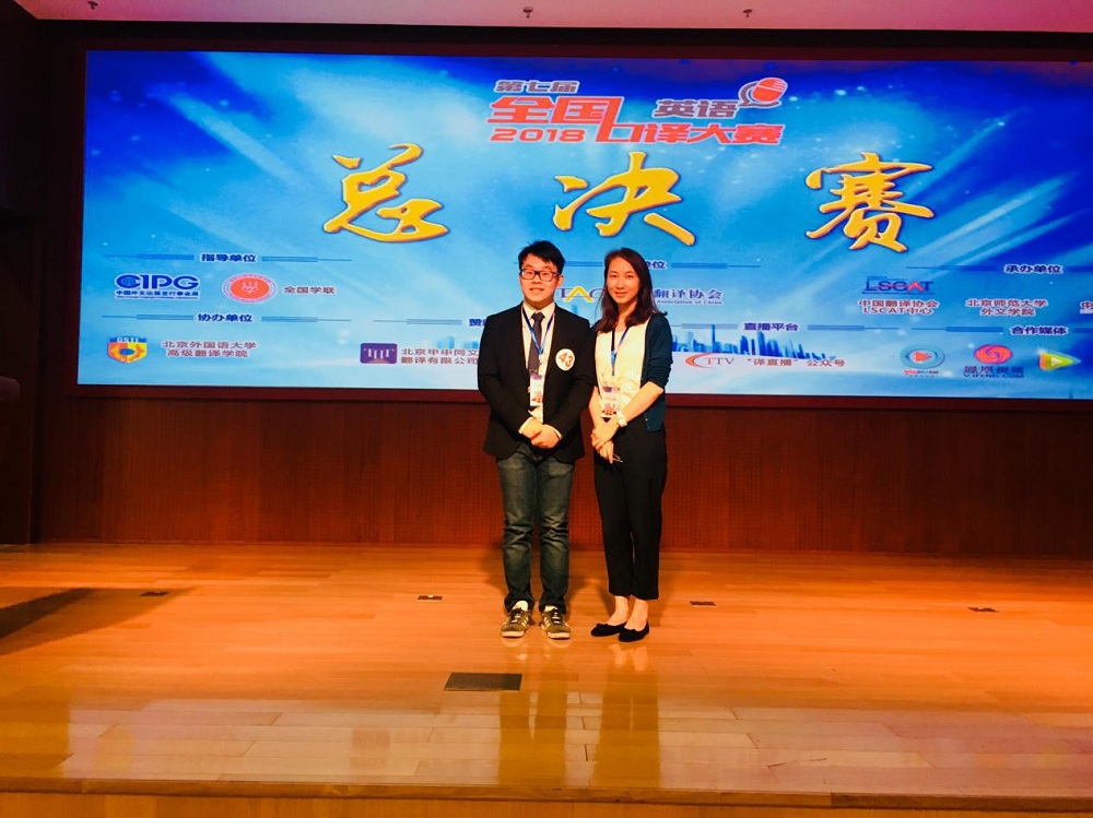 由中国翻译协会主办,北京师范大学外国语言文学学院、中国翻译协会LSCAT中心、中译天凯教育联合承办的第七届全国英语口译大赛总决赛于2018年6月23-24日在北京师范大学京师学堂隆重举行,参赛选手来自全国各地赛区中的优秀选手,参赛院校包含了北京外国语大学、广东外语外贸大学、四川外国语大学、外交学院、香港中文大学等知名高校。六十名优秀选手齐聚北京师范大学京师学堂,进行交传、同传的角逐。公司英语141班厉修远同学代表公司,发挥较出色,参加了比赛并荣获大赛三等奖。