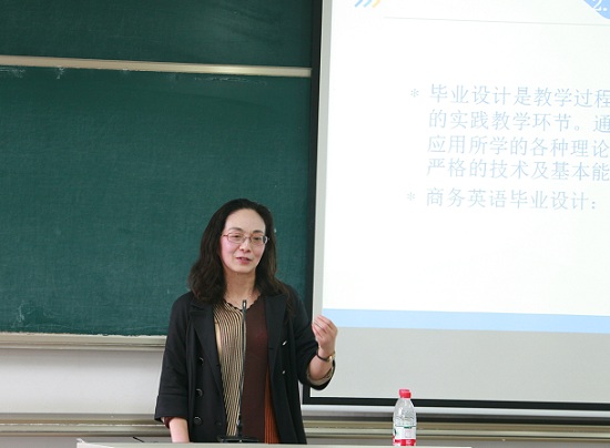在讲座中,鲍教授为师生们带来了国内最新的商务英语课程实施的理念,从商务英语专业的发展历史,到现今商务英语专业在英语学科背景下的定位,多角度进行了介绍。她认为商务英语专业不是隶属于传统的英语文学专业框架下,而是与英语文学专业以及翻译专业并列而独立的存在。谈及商务英语专业培养方向的问题,鲍教授认为应当培养具备商务英语应用能力、跨文化交际能力、商务实践能力、思辨与创新能力,能从事国际商务工作的复合型、应用型英语人才。据此,鲍教授设计了毕业论文与毕业设计两套培养途径,员工需要从中二选一,在大商务语境下,进行商务用语研究,撰写学术报告,或者通过实践报告或调研报告完成毕业设计。