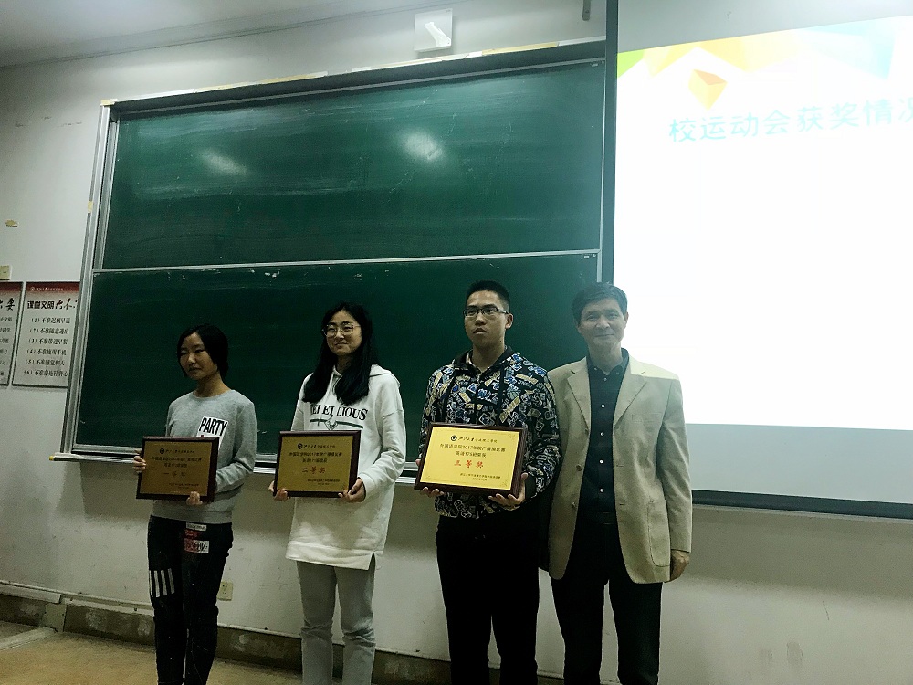 会议表彰了在运动会上表现突出的运动员、指导教师、先进工作者和优秀班集体,英语172班、英语171班、英语175班分获学院广播操比赛一、二、三等奖,史克文等54名同学被评为广播操比赛优秀个人,周哲丞等9名同学被评为优秀运动员,李梦倩等31名同学被评为运动会优秀工作者,杜建斌等2位老师被评为运动会优秀指导老师。党总支书记谌老师老师为获奖的优秀集体和个人颁发了奖状。