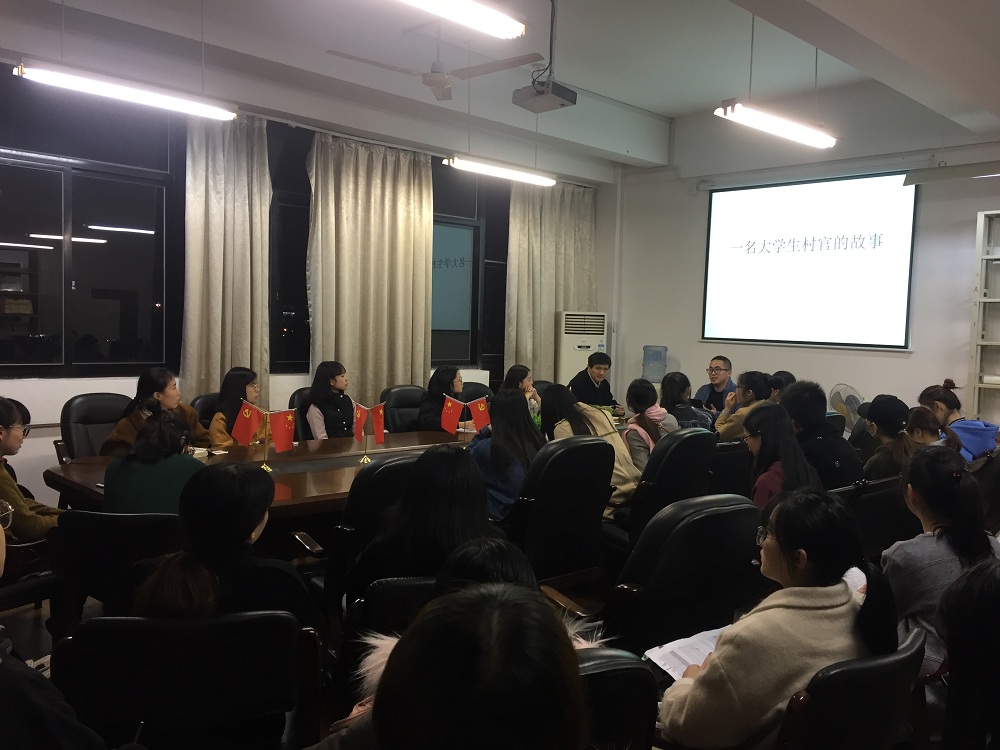 11月27日晚上,在SC408,600全讯白菜2011级优秀毕业生党员王宽跟600全讯白菜的员工党员和志愿者们相聚一堂,分享了他作为一名90后老员工村官的故事。参加此次座谈会的还有公司党总支书记谌晓煜老师,员工支部书记韩晶晶老师、刘杜娟老师,以及团委书记芦美丽老师。