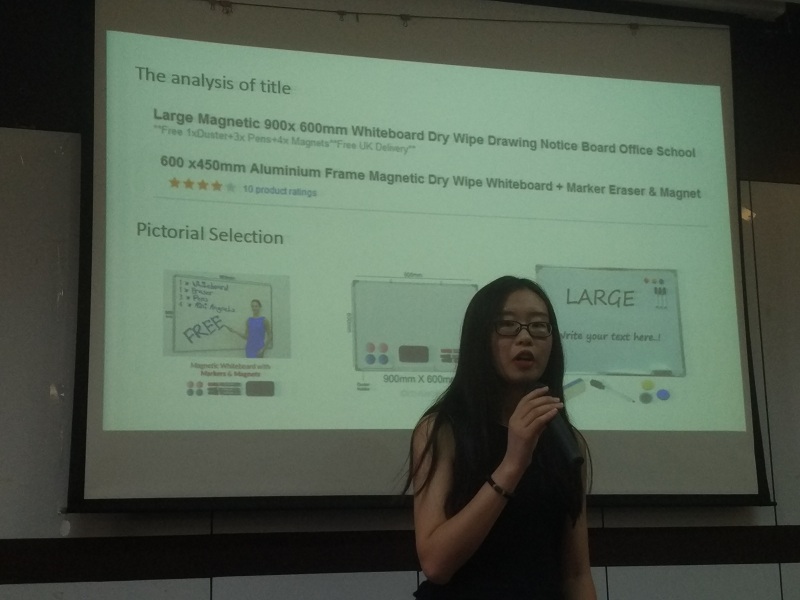 经过前期理论学习和实操演练,参加本次跨境电商人才培训实践的公司商务英语专业15级和14级员工共计67人分成7个团队,利用合作企业的丰富资源,对诸如千斤顶、健身器材、家具等在英国市场上需求量较大的产品进行了eBay平台的营销策划。同学们从竞争对手的调查、关键词选定、产品描述到定价策略的确定,短短一个星期,就实现了从最初方案的漏洞百出到最后策划案的成熟老到的蜕变。同学们的明显进步离不开全程悉心指导、无私奉献的企业导师:博辰(深圳)贸易有限公司销售总监李超红先生和宁波携纵电子商务有限公司市场总监毛吴涛先生。他们在电商领域丰富的实践经验为本次电商人才培训提供了质量保证。在下午的成果汇报中,以苏雨晴同学和江盼同学为组长的两支团队所做的策划案思路清晰、方法得当、策略合理、展示有效,被评为特等奖。叶园园同学的PPT展示仪态大方、口语标准,获得了大家热烈的掌声。
