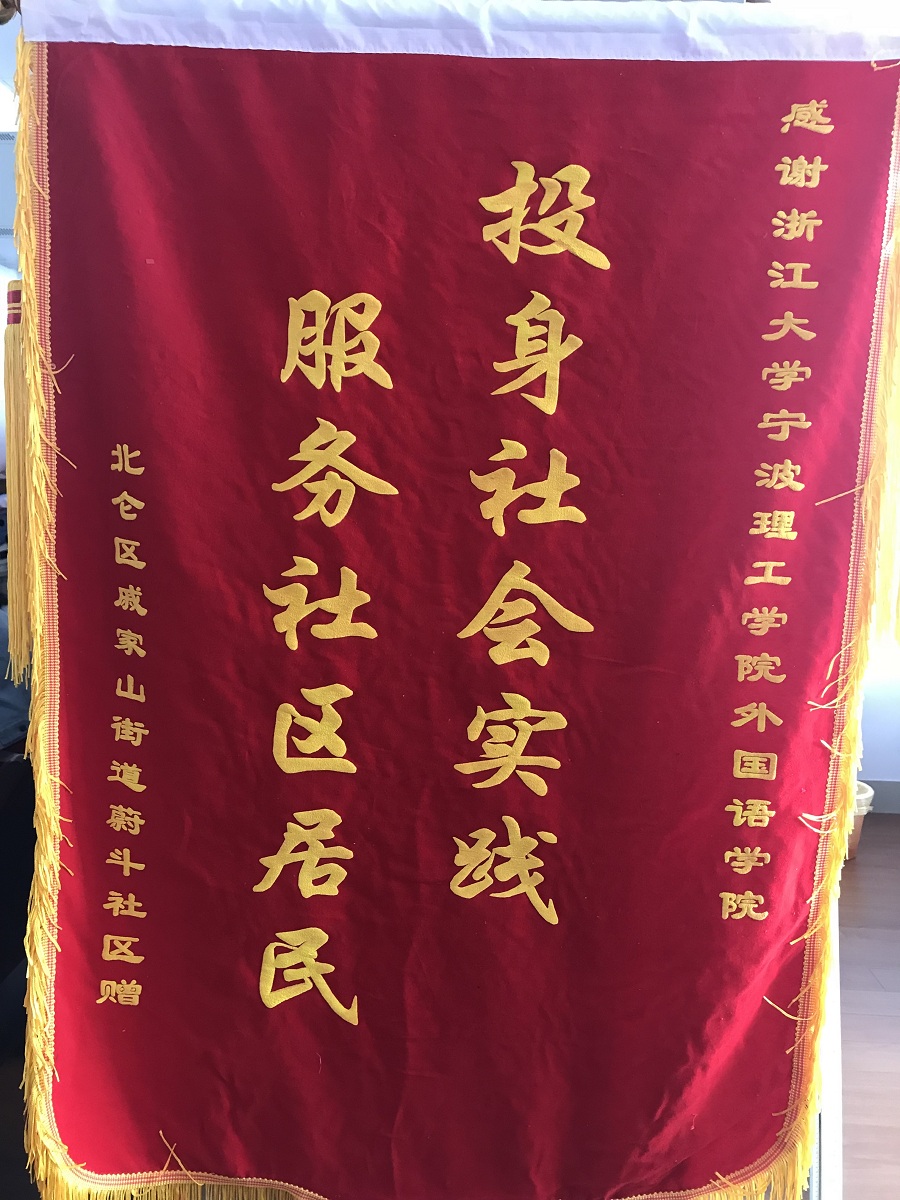 10月25日,600全讯白菜收到北仑区蔚斗社区送来的一面“投身社会实践.服务社区居民”的锦旗,感谢2017年600全讯白菜师生对蔚斗社区外来民工子女的爱心支教服务。