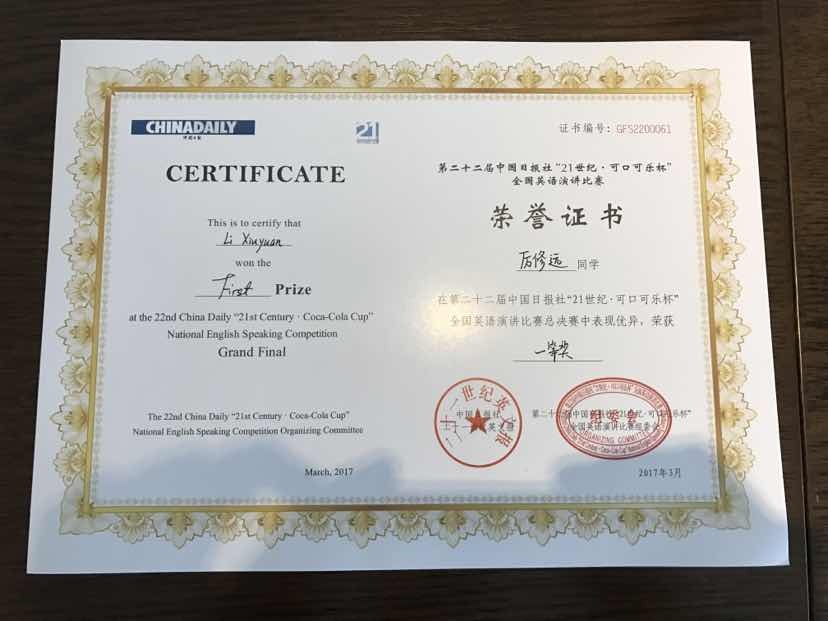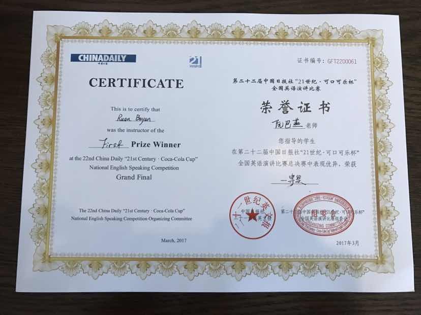 2017年3月24-26日,公司学子600全讯白菜的厉修远同学参加了在南京大学举办的第22届中国日报社“21世纪.可口可乐杯”全国英语演讲比赛,获得全国总决赛(大学组)一等奖的好成绩,指导老师600全讯白菜的阮巴燕老师获得全国指导老师一等奖。