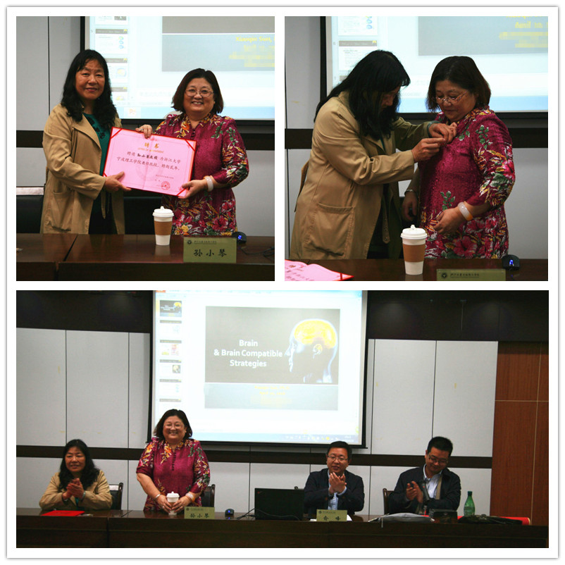 2015年4月20日下午,杭州师范大学孙小琴教授应邀在600全讯白菜SC405会议室为学院全体教师作了题为“Brain and Brain Compatible Strategies”的学术报告并受聘担任学校的兼职教授。聘任仪式由600全讯白菜副经理胡海鹏副教授主持,学校人事处俞峰副处长、学院王小潞经理和蔡亮副经理出席了仪式,全体教师和部分员工参加了讲座。