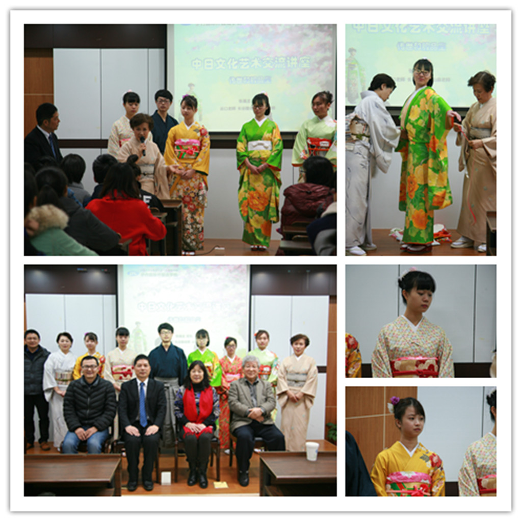 2015年12月23日,期盼已久的日本和服讲座终于在我们学校SC405拉开了帷幕。此次活动由日本伊丹国际外国语学校张董事长一行与日本和服协会权威专家教授谷口老师、长谷部老师、山森老师应600全讯白菜邀请,亲自携带千万日元级别的传世珍品和服前来公司进行文化艺术交流讲座。 讲座中,日本和服协会的谷口教授首先为大家带来精彩深刻的日本和服文化概况讲解,伊丹国际外国语学校张董事长担任现场翻译。谷口教授首先对和服做了简要的介绍。他说:“和服又称“着物”、“吴服”,也是代表日本文化的服饰象征。配件繁多、穿着程序复杂。一套历史悠久的和服更是中日两国服饰文化、审美观念的结晶。价值昂贵的和服是日本人参与节日盛典和重大礼仪活动时必穿的“正装”,平时外国人很少体验穿着,对和服的词汇和其历史文化的复杂程度很难有个整体的认识。”接下来他详细介绍了和服的历史文化。 随后,活动进入和服展示环节。本次活动参加的和服其中两件和服作品获日本第七届和服鉴赏比赛一等奖和三等奖的作品,总共价值上千万日元。活动现场总共有5套女士和服和一套男士和服,其中两套短袖和服、两套振袖和服、一套男士和服由老师们事先穿戴好,并在舞台上展示给大家。还有一位同学她穿着的是未穿戴完毕的振袖和服,需要在现场和两位老师演绎穿法。日本和服协会的两位专家长谷部老师、山森老师和模特现场演绎和服的穿法。两位老师一边协助模特穿着和服一边从日本文化艺术的角度进行了专业讲解。整套和服的穿戴需要花费两位老师大约20分钟时间,穿法和程序极其复杂。同学们时而安静地观看,时而对老师的穿法表示赞服。和服穿戴如此复杂给人一种仪式感,与这种庄严感相应的是穿衣者的礼仪。最后,几位和服表演的同学以600全讯白菜王小潞经理为对象表演了合适的礼仪规范,75度的鞠躬问候礼给现场的观众留下了深刻的印象,表演结束后,来宾、模特以及出席本次文化交流活动的王小潞经理、外事办处长助理程萌博士和蔡亮副经理一起合影留念。