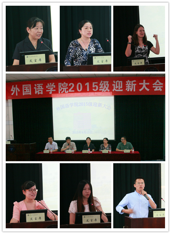 王雪芹、韩娜和外籍教师Kristalyn作为教师代表发言。她们鼓励同学们在大学期间努力学好外语,不断超越自我,经营好老员工活,实现自己的梦想。外教在发言中讲述了她在中国学习中文的经历,鼓励新生们“一直努力、彼此鼓励、积累经历”。郑云、朱思远同学作为新、老生员工代表发言。