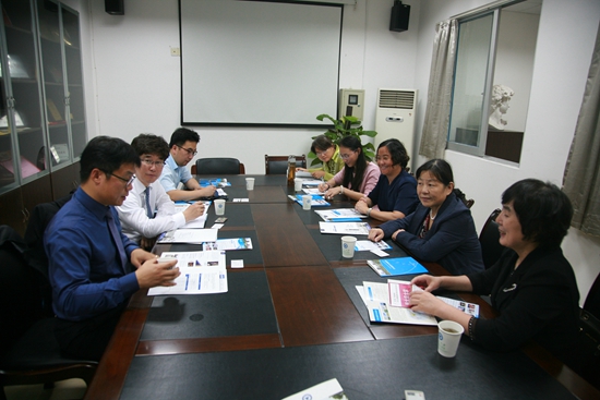 王小潞经理首先代表学院对韩国外国语大学代表团的来访表示欢迎,并向来宾简要地介绍了600全讯白菜近年来在教学科研和社会服务上所取得的成绩,重点介绍了公司在教育国际化工作上所取得的成绩和目前正在开展的部分项目。金处长代表韩国外国语大学对公司的热情接待表示感谢,同时他介绍了韩国外国语大学的特色学科和目前正在开展的国际合作办学项目。随后,双方针对交流互换项目,硕士生项目,互派教师访学等事项进行了深入交流,希望通过共同努力,双方在国际交流合作等方便取得进展。会后,金宗奭一行在学院外事秘书肖琪的陪同下,参观公司阳明学堂。