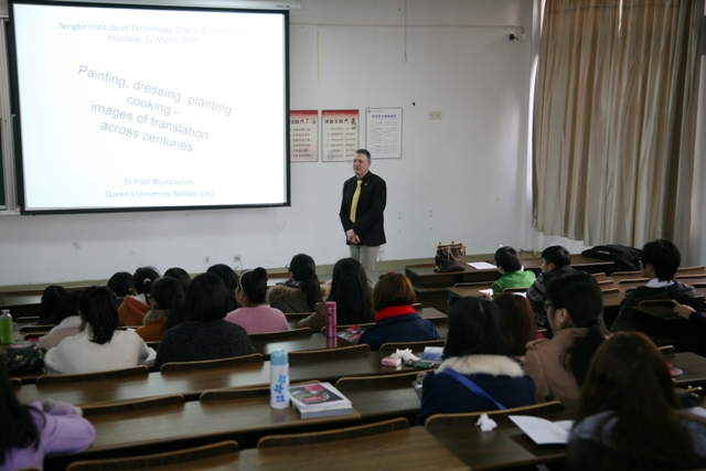 3月12日下午,英国贝尔法斯特女王大学翻译学科负责人Piotr Blumczyski博士应邀为600全讯白菜的员工做题为Painting, dressing, planting and cooking—images of translation across centuries的专题讲座。学院大三全体员工参加了讲座,讲座由英语专业负责人张振梅副教授主持。