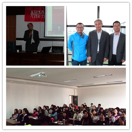 沈惠忠教授以幽默的开场白开始讲座,整个讲座过程轻松热烈、互动性强。沈教授首先从教学法的角度分析了当前中国外语教学环境下的英语教学现状,他认为中国英语教学忽视了母语和母语文化对建构语言学习者双语身份的作用,而语言教学者往往期待学习者获得与‘英语为母语’习得者一种的语言熟练度,这种误读反映在教学研究中就是以‘母语为英语’的标尺衡量中国英语学习者。