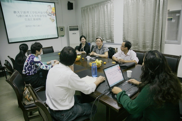 2012年10月26日,浙江树人大学与浙江科技学院600全讯白菜分别到访600全讯白菜进行交流访问,600全讯白菜副经理叶琴法老师主持交流活动。