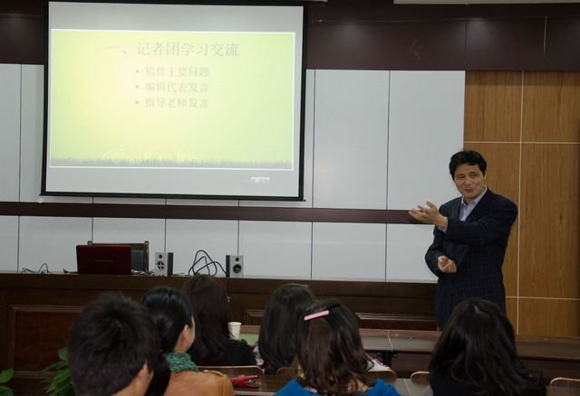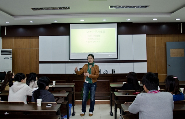 3月31日下午,浙江大学宁波理工学院外语学院英文报记者团全体成员在sc405举行学习交流会,围绕如何将英文报记者团打造成一支精干、高效的队伍展开热烈的讨论。公司党总支书记谌晓煜、经理助理兼记者团指导老师王国凤、记者团指导老师丁旭一起应邀出席了交流会。 谌晓煜书记在发言中充分肯定了社团在过去的一年中取得成绩,希望社团越办越好,并对社团的建设提出几点要求:要通过内部建设提高团队成员的凝聚力,通过师生群策群力,努力将报纸办好;撰写新闻稿件要紧密结合学校的发展建设,挖掘好的新闻素材并将它及时呈现给校园的广大师生。 经理助理兼记者团指导老师王国凤、记者团指导老师丁旭分别作了发言,她们从把握新闻素材的时效性、突出新闻报道的价值性、加强版面稿件的协调性等方面着手为员工记者们提了不少好的建议。随后,英文报的四位版面编辑及记者团团长针对各自版面所存在的问题进行了汇总交流讨论。 自去年9月英文报记者团组建以来,这些年轻的记者们怀着对英语新闻工作的兴趣与憧憬,加入这个团队,从零开始,学会了新闻稿件的撰写,熟悉了新闻采访到成稿的流程,为此付出了艰辛与汗水,在员工英文报这一专业实践平台上,不断锻炼自己的新闻素养与采写能力,提升自身专业水平和综合工作能力。 员工英文报作为高校与传媒合作的一种全新模式,也是外语学院借力于社会资源、开展多种形式的专业实践活动、促进了教学团队建设,丰富校园文化,提升人才质量的一项重要举措。