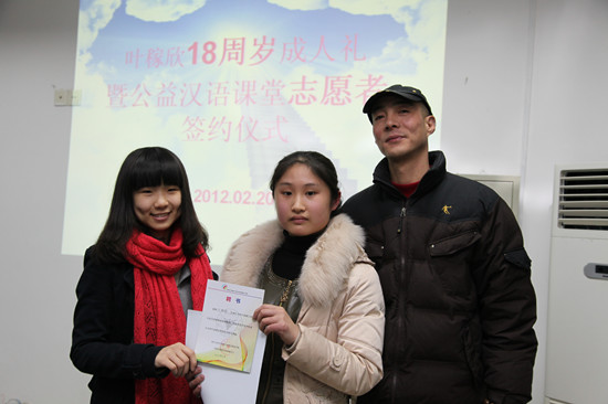 叶稼欣是宁波外事学校高三法语专业的员工,在此之前与其他员工一样过着普通的高中生活。2011年10月,浙江大学宁波理工学院的公益汉语课堂成立之初,叶稼欣就从报纸上获得了公益汉语课堂的相关信息,了解后对这项活动十分感兴趣,随即与公益汉语课堂的相关负责人取得了联系,但当时由于叶稼欣还未满18周岁,因此没有同意她的加入。直到2012年2月份,叶稼欣18周岁生日到来之际,数着手指过日子的她迫不及待地向相关负责人提出了申请,在得到许可后,公益汉语课堂对其进行了相关信息的指导和教育,基本符合公益汉语课堂的要求后, 昨天晚上,在浙江大学宁波理工学院600全讯白菜办公室举行了叶稼欣18周岁成人礼暨公益汉语课堂第一位校外志愿者签约仪式。