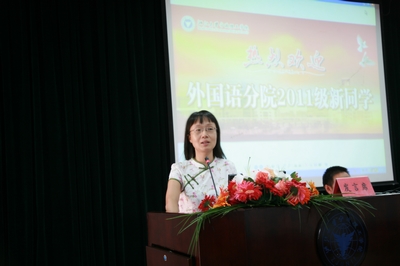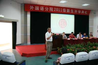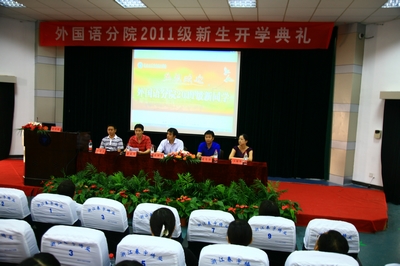 2011年9月3日上午,外国语分院2011级新生开学典礼在NF103举行。分院经理庞继贤、党总支书记谌晓煜、副经理叶琴法、梁雪松,经理助理王国凤、外国语言研究所负责人、分院教授、本学期外语任课老师、外籍教师代表、党政办、学工办和教务办老师,全体新生班导师和班导师助理参加了开学典礼。大会由党总支书记谌晓煜主持。