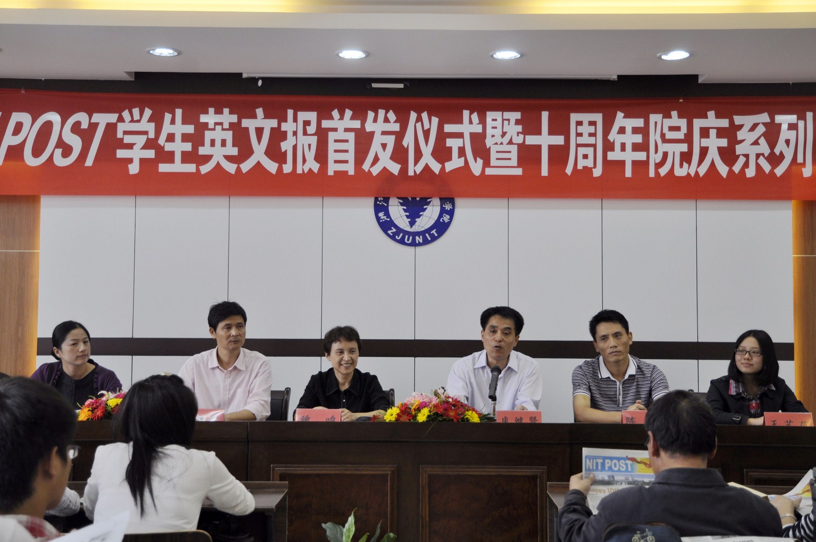9月22日下午,外国语分院在分院会议室举行了简短而隆重的Zhejiang University NIT Post(《浙江大学宁波理工学院员工英文报》)首发仪式。公司党委副书记魏鸣,宣传部部长陈斌,外国语分院经理庞继贤,党总支书记谌晓煜,经理助理王国凤,全体英文报指导老师,员工英文报记者团成员和分院部分师生出席了仪式,仪式由王国凤老师主持。