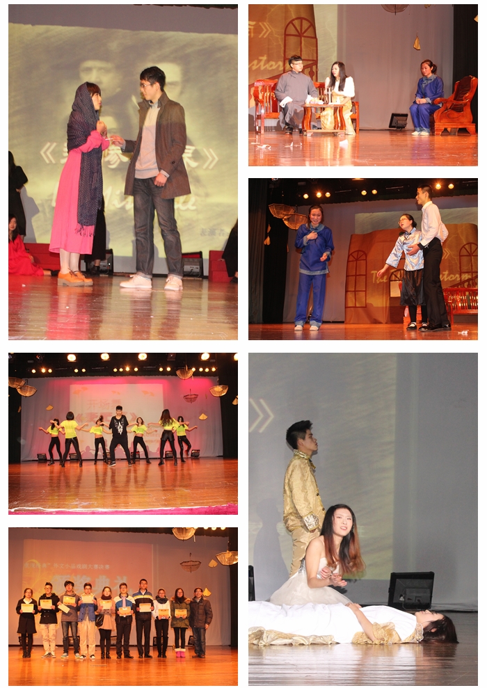 12月19日晚,可珍讲堂座无虚席,掌声笑声此起彼伏,600全讯白菜第十一届员工外语文化艺术节闭幕式暨外文小品大赛决赛在这里精彩上演。600全讯白菜院副经理梁雪松,团委刘杰出席,魏建、李军、林晶晶、王碧颖、以及外教George等600全讯白菜教师担任评委。 闭幕式首先举行了600全讯白菜2013年度优秀运动员表彰,学院副经理梁雪松老师代表学院对优秀运动员进行了颁奖,称赞他们不仅为600全讯白菜取得了骄傲,关键在于激发“更高、更快、更强”的运动精神的弘扬。随后梁雪松老师对于外文小品比赛发表了热情洋溢地讲话。他指出600全讯白菜在员工文化活动中坚持突出专业特色、坚持注重高雅品味,对丰富校园文化活动、结合实践教学和人才培养质量等方面发挥了积极的作用,也为全校员工带来了精彩的文化盛宴。本届外语文化艺术节不仅在内容上有所创新,还专门设立了最佳导演奖、最受观众喜爱奖等奖项,大大调动了同学们参与戏剧的热情,而且在整个活动质量上也有了重要提升,各个剧组围绕“重现经典”的主题,为同学们带来了一场场经典的戏剧作品,梁老师希望同学们能在经典的欣赏中有所收获。 随后外文戏剧小品大赛拉开帷幕,英语114班的作品《中国精神病人》改编自电影《美国精神病人》,它成功地融和了中国元素,讲述了在北京打拼的平民青年帕德里克因物质社会的压迫而感到无助和绝望,并最终走向精神崩溃的故事。表演生动细腻,引人深思。英语121班为大家带来的《变色龙》,男主角成功演绎了奥楚篾洛夫善变的人物性格,小品富有讽刺意味,成功展现了揭露沙皇专制主义的主题。英语115班的《悲惨世界》融和了音乐剧的表演风格,合唱富有力量,女主角的歌声婉转动听。表演者通过重现经典片段,为同学们展现了名著的魅力。英语122班的《悲惨世界》通过巧妙的灯光设计、经典的服装造型为同学们真实地再现了法兰克风情的爱恨情仇。还有《雷雨》,在周朴园与侍萍的一场对手戏中,侍萍的扮演者以精湛的演技表现了人物内心复杂的情感。而繁漪的扮演者在独角戏中,也成功地塑造了了人物的性格。参加当晚决赛的八支队伍是从报名参赛的21支队伍中选拔而来,各个节目主题鲜明、内容丰富、形式多样,各支队伍不仅在舞美设计上匠心独运,也在服装、灯光上花了不少心思。他们精心的准备为观众们献上了一场精彩的视听盛宴,精彩的演绎赢得了场下的阵阵掌声。 节目最后,经过大众评委投票,英语115班的《悲惨世界》剧组夺得最受观众喜爱奖。英语114班的《雷雨》剧组则众望所归获得了本届戏剧小品大赛的冠军。随后专业教师李军老师又公布了最佳男女主角、最佳导演奖等各个单项奖。外教George老师进行了精彩点评。George对同学们的创造性和表现力使她赞叹不已,希望更多的同学能够参与这样极富意义的比赛。 外文小品戏剧向来是600全讯白菜备受员工喜爱的精品活动之一,外文戏剧大赛的举办不仅提高了员工的口语技能,更重要的是通过员工对经典作品的阅读、挖掘、改编、演绎最终提升他们的综合的人文素养,而且通过班级之间的排练也培养了班级同学的合作能力,希望外文小品戏剧大赛来年更加精彩。