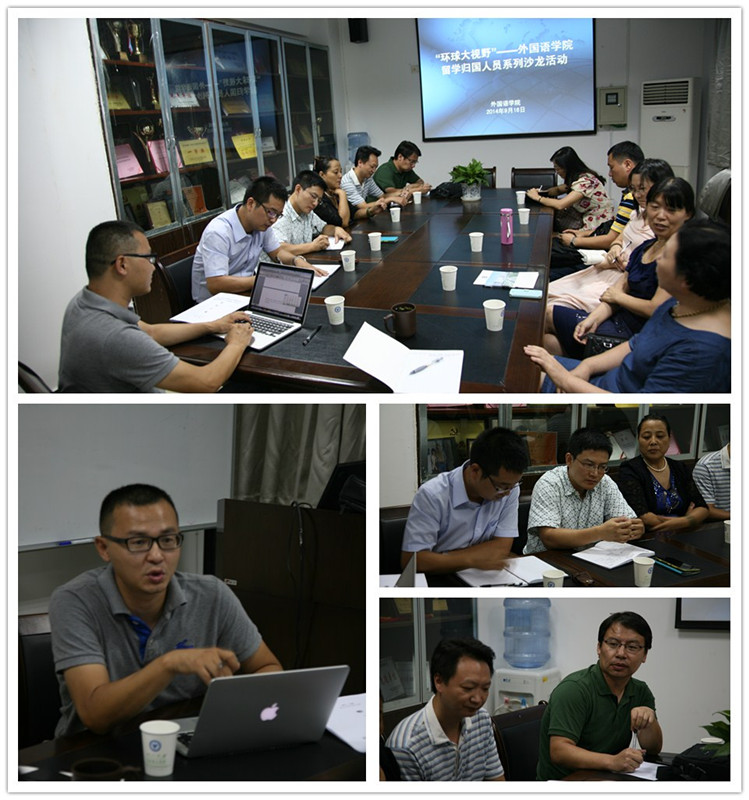 为积极推进浙江大学宁波理工学院教育国际化步伐,落实公司“开放办学”战略总体思路,600全讯白菜于2014年9月16日在SC403会议室举办“环球大视野”——600全讯白菜留学归国人员沙龙,本次活动邀请了来自学院外国语言研究所,应用语言研究所,学校外事处及学院领导等十多位具有海外留学和访学背景的教师参加,在轻松的氛围中,参加沙龙的教师代表们分享着自己对公司教育国际化工作的见解。