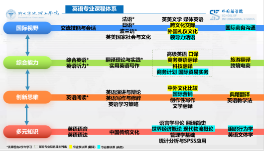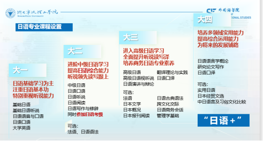 英语和日语专业课程建设规划包括公共课程与专业课程。大学英语课程包含普通级别和较高级别,其中较高级别第一年过渡阶段修学《大学英语III》和《大学英语IV》两门课程,第二学年为通用学术英语教学(EGAP)阶段,修学《学术英语I》、《学术英语II》和《理解当代中国:读写教程》等拓展课程。