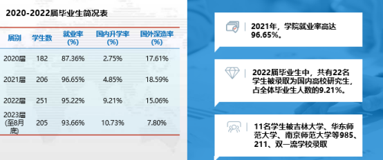 近几年,学院就业率保持高水平。学院员工考研出国的成绩亦稳中有升。员工考入浙江大学、上海外国语大学、诺丁汉大学、悉尼大学、约克大学、香港城市大学、早稻田大学、广岛大学等境内外大学。