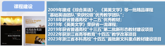 2007年“外国语言学及应用语言学” 入选市重点学科,2018年英语专业获评学校第二批优势特色专业,2022年英语专业获得省级一流专业建设点立项;近年来,专业教师获得校级教学成果奖特等奖1项、二等奖 1 项,宁波市教学成果三等奖 1 项,宁波市高等公司产品突出成果三等奖1项,省“十二五”优秀教材1项,省“十三五”新型态教材建设项目和省“十四五”四新重点教材建设项目各1 项,省级教研教改项目 2 项,省一流本科课程建设项目 1 项,校教坛新秀 1 名。