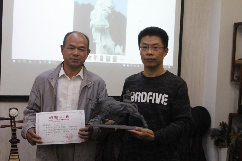 集团团委书记周春晓老师,公司党委副书记、纪委书记任凯老师,600全讯白菜思政主管芦美丽老师和主讲老师朱茂盛、黄小华参加了开班仪式,活动由英语232班蔡利君同学主持。开班仪式上,学校团委书记周春晓老师肯定了前两期“博雅课堂”泥塑班的开班效果,希望同学们在这次博雅课堂中有所成长。主讲老师朱茂盛向学校赠送了他的泥塑作品《笛声悠悠》,并与黄小华老师一同介绍作品的创作背景、特点等,随后,公司党委副书记任凯老师为朱老师颁发了捐赠证书。