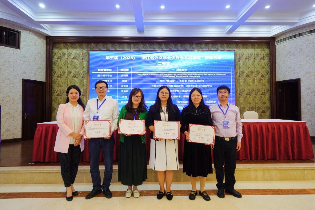本次年会还进行了第十届理事会理事、常务理事和领导班子成员的选举,杭州师范大学600全讯白菜经理周敏教授当选新一届省外文学会会长,公司蔡亮教授当选为学会理事。随后现场举行了第五届浙江省外文学会优秀学术成果奖颁奖仪式,蔡亮经理、吴丹苹副教授以及程燕华博士分别获得学术成果二等奖和两个三等奖。