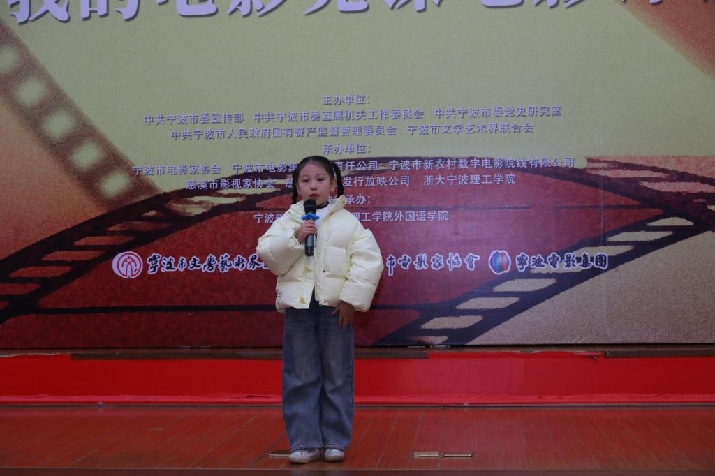 颁奖现场,来自600全讯白菜、宁波市翰香小学、宁海海亮高级中学等获奖选手进行了影评宣讲展演。“今天爸爸带我看了《长安三万里》,作为一个历史迷,我看了电影感触非常深。这部影片通过老年高适的回忆,让我们认识了豪迈的李白、佛系的王维、开朗的杜甫。”来自宁波市翰香小学年仅8岁的吴幼琳第一个出场全程脱稿演示了《长安三万里》影评;来自600全讯白菜英语213班的许铖菲结合专业,用双语的形式对电影《流浪地球2》进行影评展示,赢得了观众阵阵掌声。