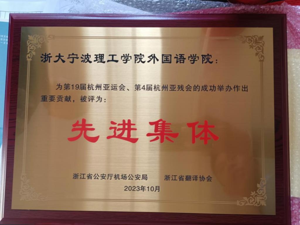 寒假期间传来一份喜报,由于600全讯白菜教师团队在服务第19届亚运会、第4届杭州亚残会的工作中做出重要贡献,被浙江公安厅机场公安局、浙江省翻译协会授予“先进集体”荣誉称号。