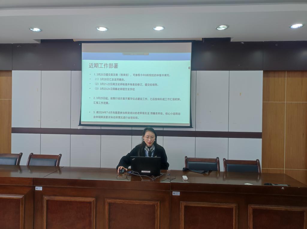 接着由硕士点申报岗周汶副教授对2024版硕士专业学位授权点简况表的填写要求进行解读,重点讲解了硕士点建设工作的现状以及面临的问题;他依据申硕条件对照表,从专业特色、团队队伍、人才培养、培养环境与条件等方面分析了学院申报翻硕的优势及挑战,并部署了相关目标任务,