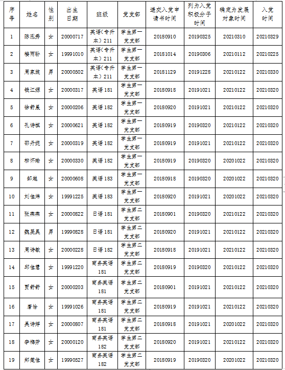根据陈泓秀等19名同志的现实表现和党组织的培养考察,经本人申请、支委会审查,拟将陈泓秀等19名同志按期转为正式党员。为进一步增强发展党员工作的透明度,接受党内外群众的监督,确保发展新党员的质量,现予以公示。在公示期限内,欢迎广大师生通过信函、电话或直接反映问题。以个人名义信函反映提倡署真实姓名。公示7天,时间自2022年3月14日至2022年3月20日。