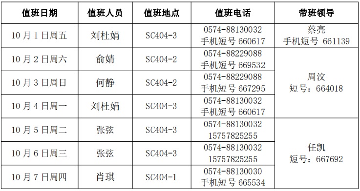 4、带班领导值班地点在宁波,保持手机畅通。