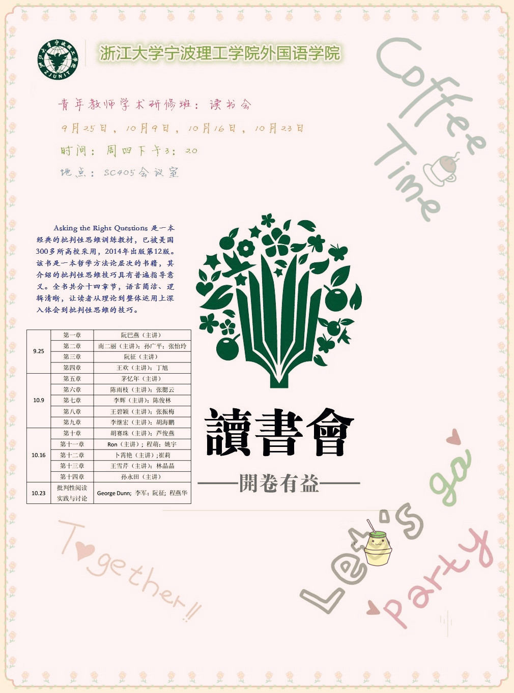 读书会是“600全讯白菜青年教师学术研修班”的重要组成部分,目的是通过读书与讨论,提高青年教师的学术水平与科研能力,培养具有国际视野的外语学术人才。