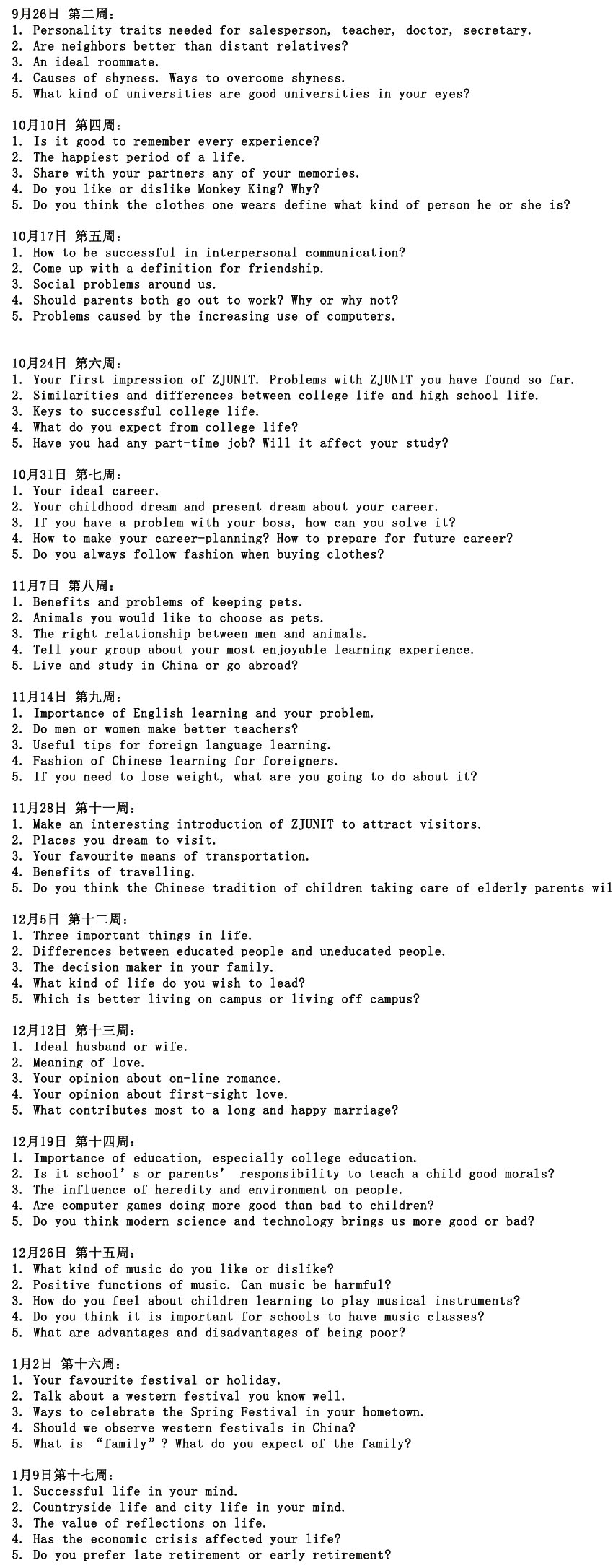 2012—2013学年第一学期外语角讨论话题